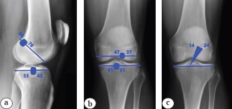 Figure 1. Plain X-rays of the knee joint showing anatomical tunnel parameters and GIA: a — sagittal tunnel positions; b — coronal tunnel positions; c — graft inclination angle
