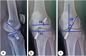 Figure 2. A patient’s postoperative X-rays showing anatomical tunnel parameters and GIA: a — sagittal tunnel positions; b — coronal tunnel positions; c — graft inclination angle