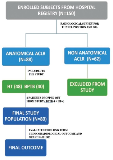 From the hospital registry 150 patients were enrolled for the study. They were subjected to radiological examination for tunnel positions and GIA. Among them, 88 patients (BPTB group — 40, HT group — 48) had anatomical ACLR. Remaining 62 subjects who had nonanatomical tunnel positions and GIA in both groups were excluded from the study. Due to various reasons 8 patients out of 88 study subjects dropped out from the study, leaving a total of 80 (BPTB group — 36, HT group — 44).They were finally evaluated for clinico-radiological outcome measures. The flow chart of patient selection for the study shown in Figure 3.