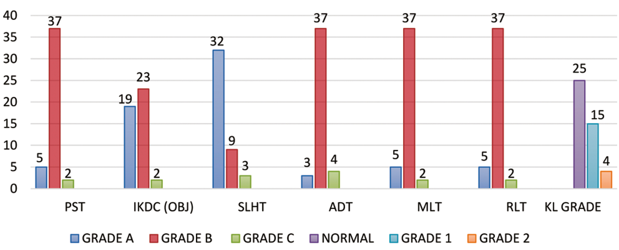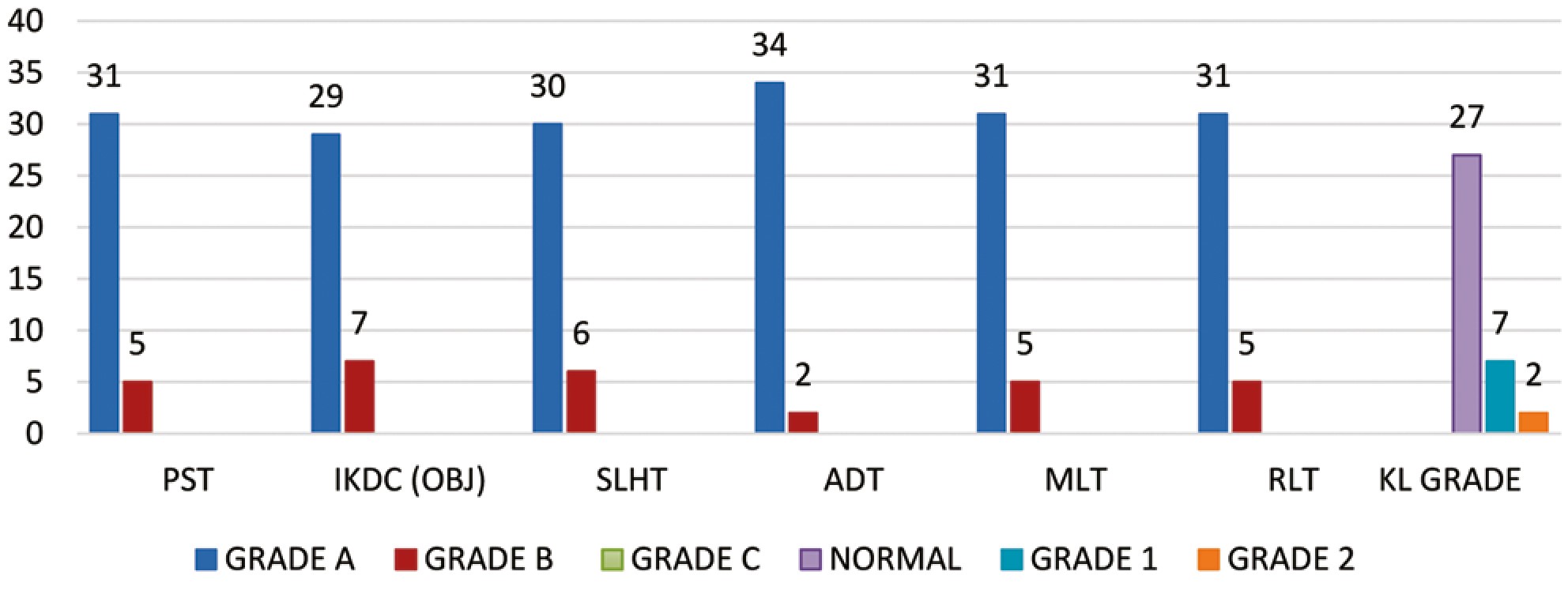 The postoperative radiological laxometry test assessment has shown better outcome in the BPTB group compared to the HT group (BPTB/HT) as follows: (Grade A — 31/5, Grade B — 5/37 and Grade C — 0/2) and the difference was statistically significant (p = 0.001). There was no difference in OA change between the two groups (p = 0.550) (Table 6). Interestingly, none of the patients has shown progression of osteoarthritis at long-term evaluation and the current postoperative KL grading remains the same as that of their preoperative KL grading in all the patients.