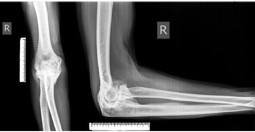 Fig. 1. X-rays of the affected elbow joint in the anteroposterior and lateral views: signs of deforming osteoarthritis — narrowing of the joint gap, massive ossificates