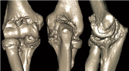 Рис. 2. Трехмерная реконструкция пораженного оссификатами локтевого сустава, выполненная на основе МСКТ (передний, задний, латеральный отделы сустава) также не позволяет полностью визуализировать оссификаты