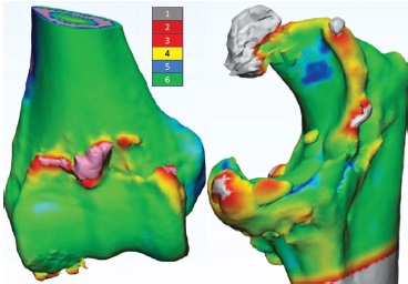 Рис. 3. Программное разделение костей локтевого сустава и детальная визуализация расположения и размеров оссификатов (передний отдел дистального конца плечевой кости и дистальный отдел локтевой кости). Градация размеров оссификатов по шкале: 1— выше порогового значения; 2–4 — гипертрофированные участки костной ткани в порядке уменьшения размеров оссификатов; 5 — дефекты костной ткани; 6 — нормальная костная ткань, не отличающаяся от модели контралатерального (здорового) сустава