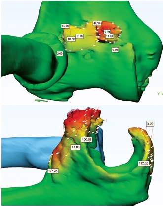 Четвертый этап. Финальный этап 3D-реконструкции включает определение четких размеров оссификатов и их локализацию, что может быть использовано при выборе доступа или доступов и изменения тактики выполнения оперативного вмешательства (рис. 4).