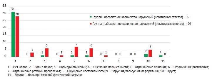 Рис. 7. Среднесрочные результаты оценки эффективности лечения в двух группах сравнения, связанные с общими нарушениями функции после оперативного вмешательства. По оси Х — исследуемые параметры, по оси У — количество пациентов с наличием нарушений