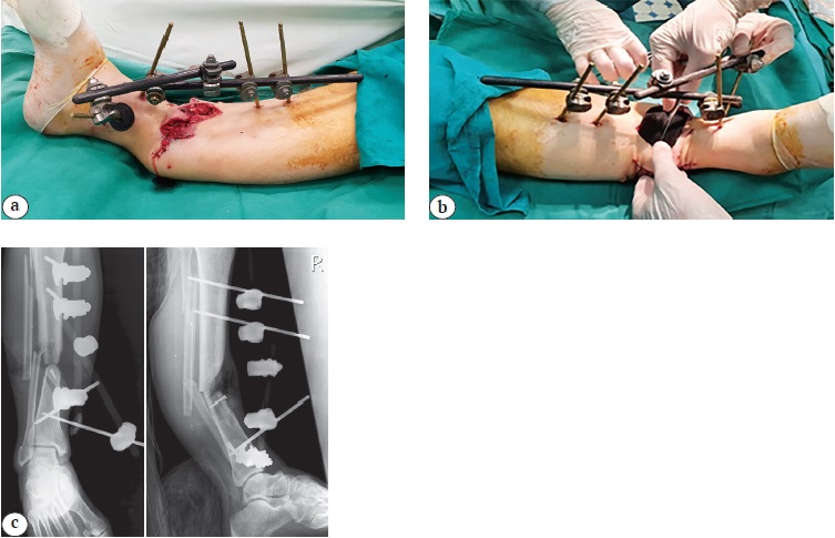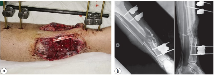 Eight days after admission, as a result of treatment procedures, the wound was cleaned, and granulation tissue appeared. The external fixator was reinstalled, and the soft tissue wound defect was closed with local tissues and a split skin autograft (Figure 3).