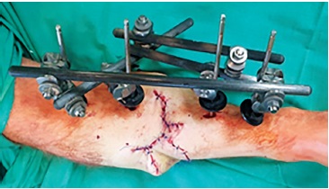 Three days after admission, the patient underwent surgery: a repeated debridement of the lower leg wound, during which devitalized tibial fragments were removed. One of the bone fragments, which had not lost connection with the soft tissues, was fixed with a screw to the distal fragment of the tibia. To reduce the wound size, acute shortening and angulation of the lower leg were performed. The intentional angular deformity of the lower leg was 24º, and the shortening was up to 8 cm. During the shortening, blood flow in the distal parts of the limb was monitored using Doppler sonography and pulse oximetry. The remaining wound defects were covered with a vacuum drainage system (Figure 2).