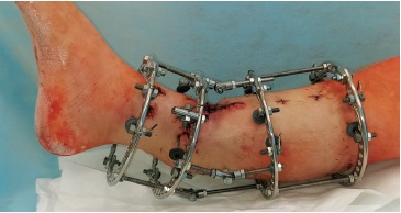 Figure 4. View of the lower extremity on the 1st day after surgery: the right lower leg is fixed with the Ilizarov hinged-distraction apparatus