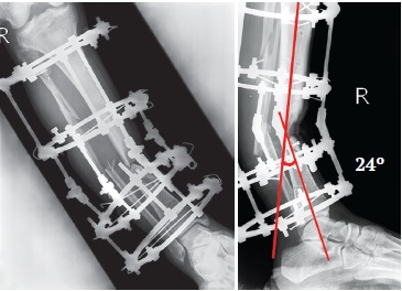 Figure 5. X-rays of the lower leg in frontal and lateral projections after fixation with the Ilizarov hinged-distraction apparatus, the recurvation angle was 24º