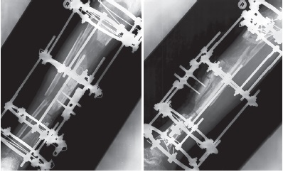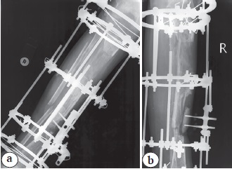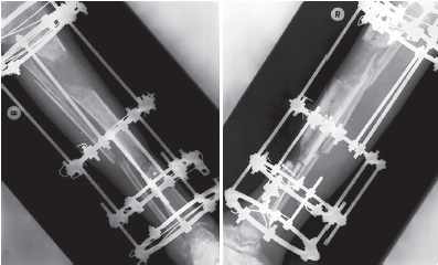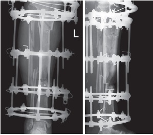Figure 7. X-rays of the lower leg in frontal and lateral projections after restoration of limb length: maturing tibial regenerate