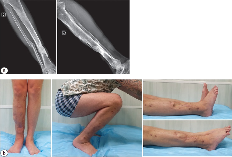 Case description. A 30-year-old wounded man was admitted to the clinic with an extensive defect in soft tissues and bones of the lower leg in the middle third. To reduce the wound size, acute shortening and angulation of the lower leg was performed. The intentional angular deformation was 24º, shortening — up to 8 cm. The residual soft tissue wound defect was closed with local tissues and split skin autograft. The tibia was fixed by the Ilizarov hinge-distraction apparatus with following gradual correction of the angular deformity. After that, one performed osteotomy of the tibia in order to eliminate shortening with the Ilizarov method (the distraction rate of 1 mm per day). After restoring the length of the lower leg, in order to replace the defect along the anterior surface of the tibia, a marginal “flake” was formed from a displaced fragment. At a follow-up examination, in 18 months after the injury the patient walks with full weight bearing on the injured limb without any additional means of support, continues to perform military service duties in accordance with his position.