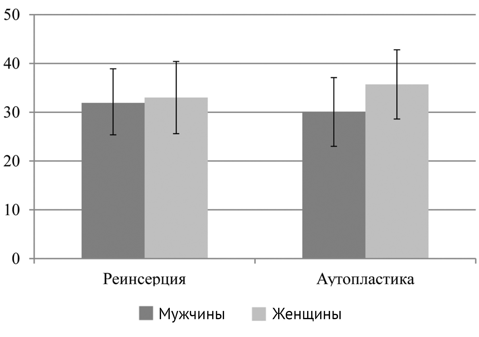 In addition to concomitant meniscal injuries, each group included patients with chondral defects. In the repair group, their share was 15.50±0.04% (13 patients), while in the autograft group it was 10.50±0.03% (9 patients) (p>0.05).