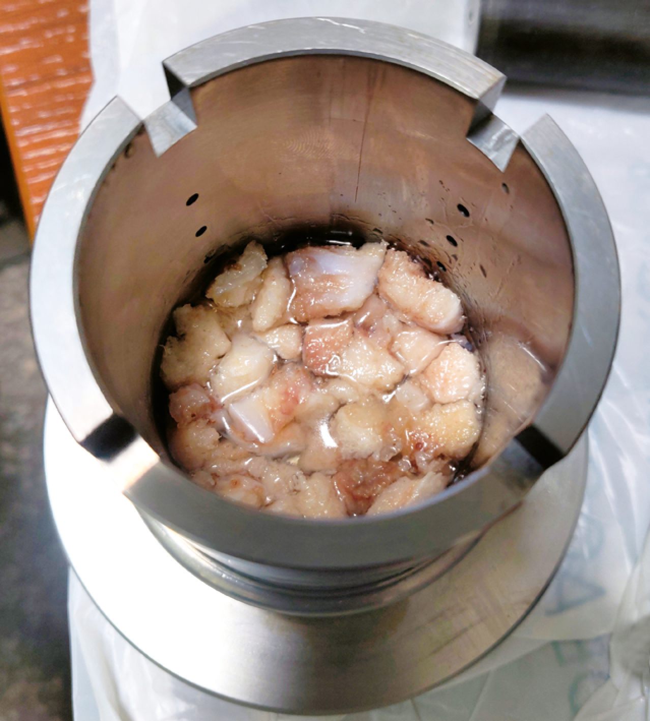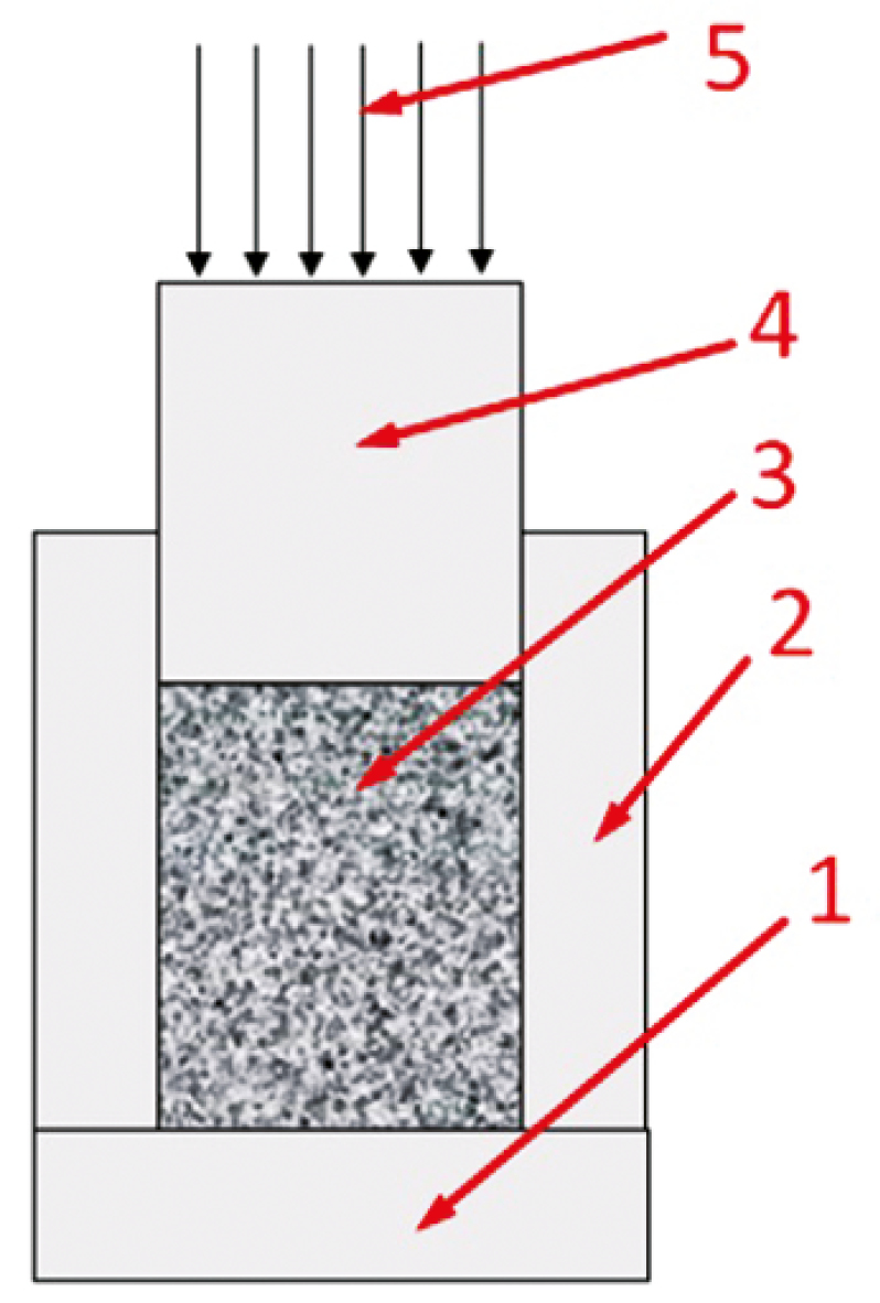 Образцы КПМ помещались в полый металлический цилиндр со съемной платформой для извлечения образцов. Было использовано 2 вида полых цилиндров: один со сплошной боковой поверхностью и второй с отверстиями на боковой поверхности для дренирования излишков жидкости, что соответствовало открытому и межфрагментарному пространству частиц КПМ при ревизионных операциях. Последний был использован в одном случае с образцом с жидкостью (рис. 2). Для компрессии КПМ в цилиндре использовался штамп, соответствующий внутреннему диаметру цилиндра.