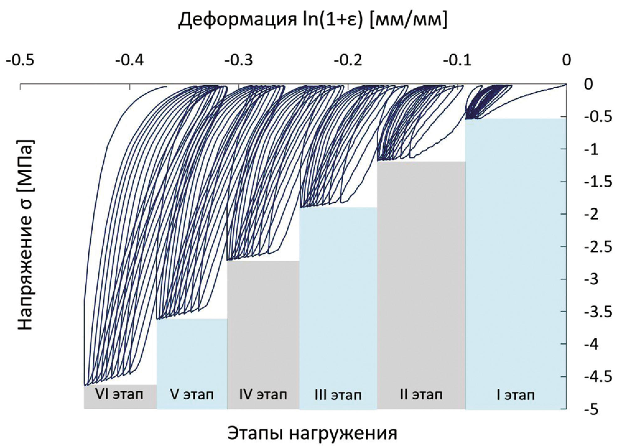 На втором этапе исследования проведены циклические испытания на образцах № 2–5 через 2 мес. в связи со значительной релаксацией материала, полученной на первом этапе. Образцы хранились в холодильнике при температуре -20°С. Каждый образец циклически нагружался в 6 этапов. Начальная сжимающая нагрузка составила около 980 Н. Каждый этап состоял из 10 циклов нагружения при постоянном значении нагрузки. После каждого 10-го цикла происходила релаксация напряжений, т.е. на 10-м цикле штамп сжимал материал и оставался в положении максимального сжатия на 300 сек. В течение этого времени напряжения в сжатом материале ксенокости снижались за счет процесса релаксации, когда происходит перестроение материала на микроструктурном уровне в стремлении к состоянию равновесия и минимуму полной энергии системы. Например, этот процесс релаксации хорошо виден на VI этапе нагружения на последнем 10-м цикле (рис. 3.), когда от пиковых значений напряжения падают по прямой от 4,7 МПа до 3,2 МПа при постоянном значении деформаций 0,43. Затем по истечении 300 сек. происходила полная разгрузка образца. После этого начинался следующий этап, нагрузка увеличивалась на 1000 Н, и образец снова сжимался в течение 10 циклов при новом постоянном значении нагрузки с последующим процессом релаксации. Описанная методика повторялась на каждом из 6 этапов эксперимента. Предполагалось, что за счет увеличения нагрузки на каждом этапе материал будет уплотняться, и, соответственно, будет увеличиваться модуль Юнга. Процесс релаксации в эксперименте моделировал периоды отдыха пациента, когда аллокость находится в статическом состоянии сжатия без воздействия циклического нагружения.