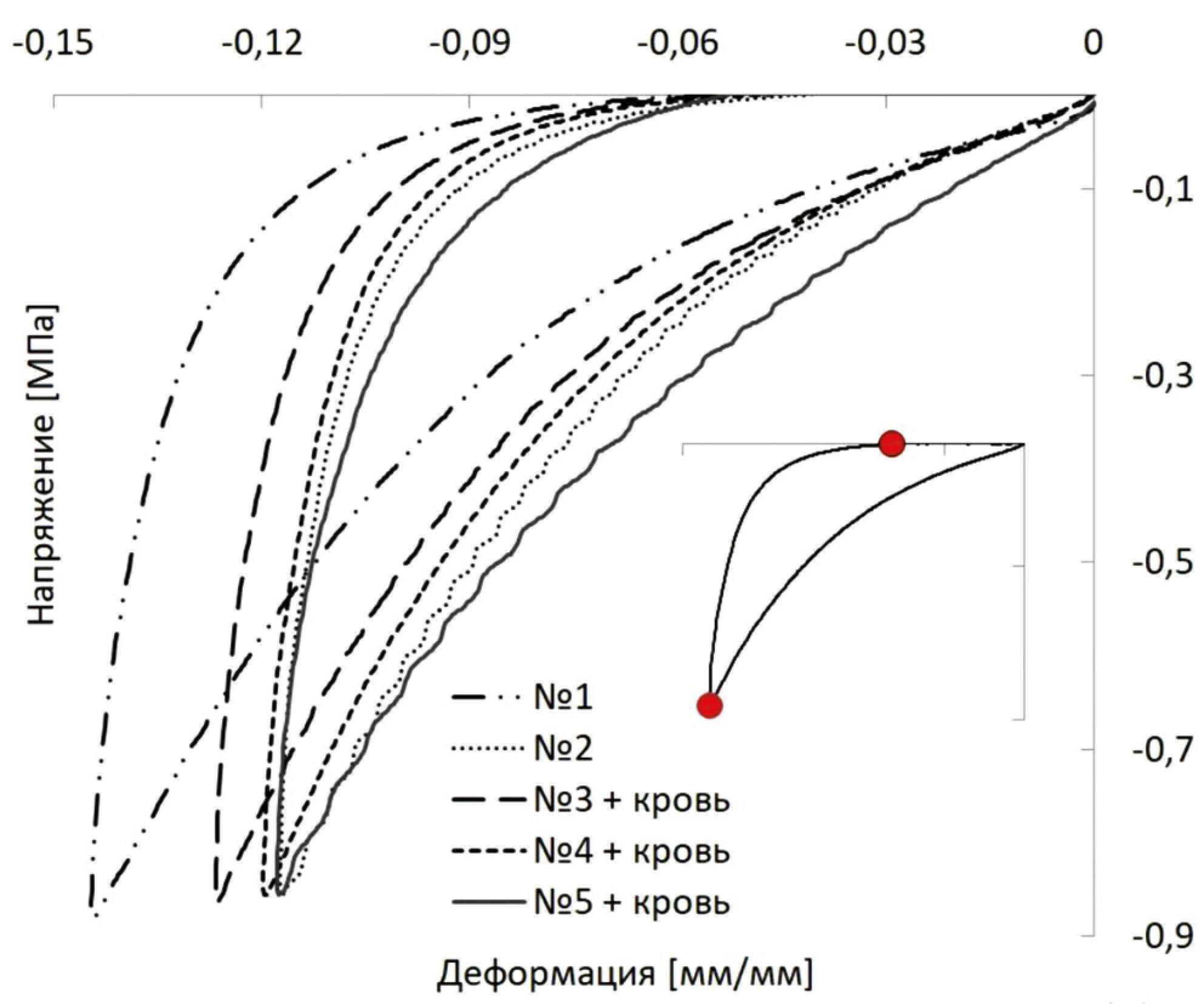 Результаты определения мгновенного модуля упругости и коэффициента Пуассона при одноцикловом всестороннем сжатии представлены в таблице 1. Эти механические параметры материала соответствуют начальному состоянию аллокости сразу после операции до воздействия какого-либо циклического нагружения.