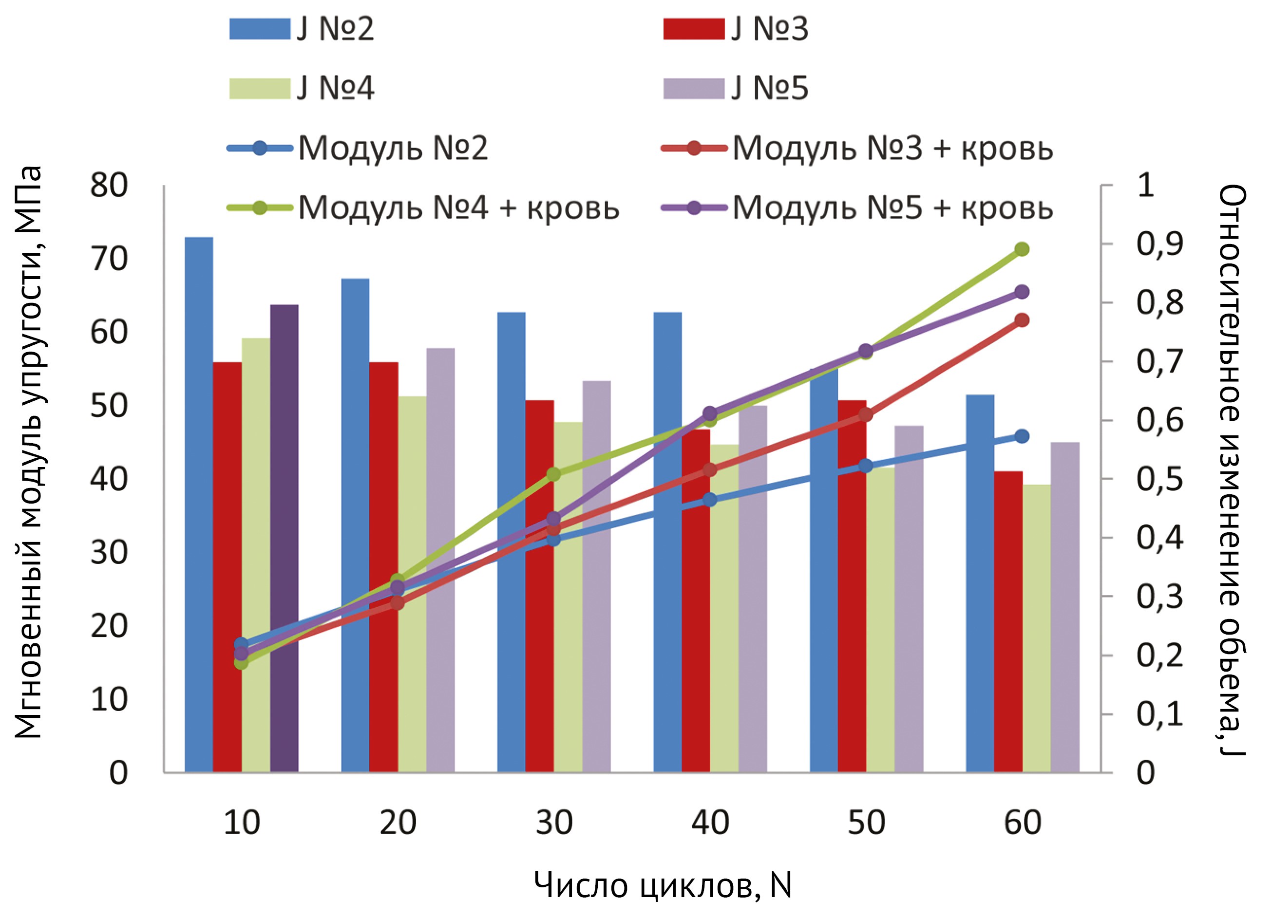 В начале нагружения значения мгновенных модулей упругости для всех образцов приблизительно равны. С увеличением циклов нагружения модули упругости растут, что указывает на уплотнение материала и уменьшение его объема (рис. 5). То есть параметры модели материала будут зависеть от относительного изменения объема образца E = E(j). Необходимо отметить, что значения модулей упругости образцов с жидкостью оказались выше. Было получено увеличение мгновенного модуля упругости в 2,6 раз для «сухого» образца, а для образцов с жидкостью в диапазоне от 3,9 до 4,7 раз, что может свидетельствовать о большем уплотнении и уменьшении объема импактированного КПМ in vivo в присутствии крови.