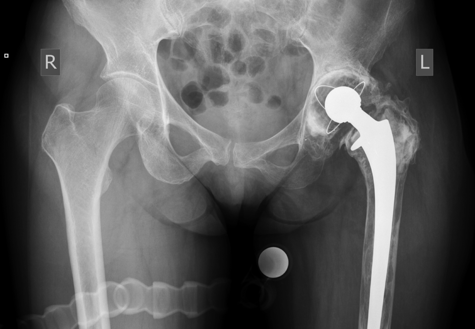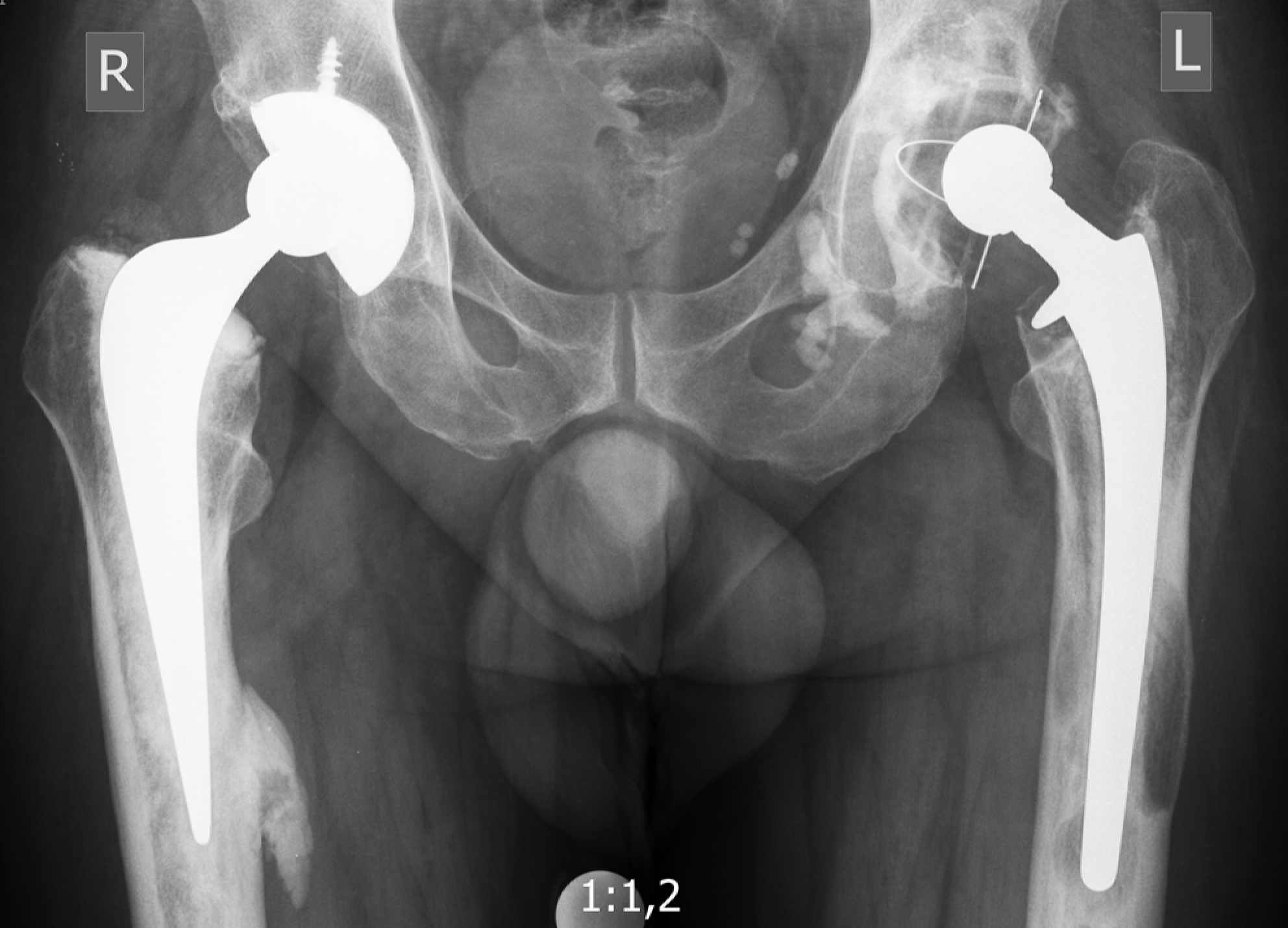 Figure 6. Plain X-ray of the pelvis of patient 1. Signs of loosening of the pelvic and femoral components of the left hip joint endoprosthesis and femoral osteolysis on the left are observed