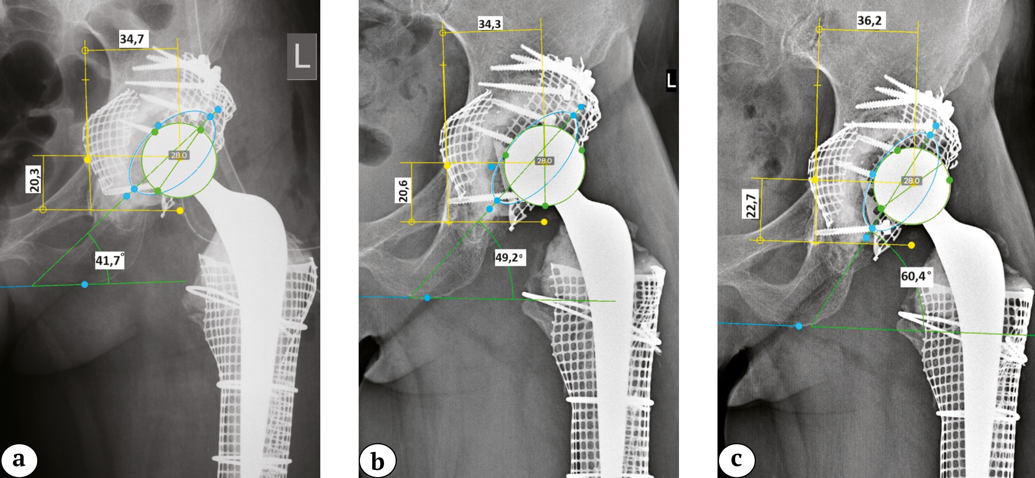 Рис. 7. Клинический пример миграции тазового компонента у пациента 1 без развития расшатывания: a — после операции; b — через 3 года; c — через 7 лет (смещение проксимально и латерально, увеличение инклинации и изменение антеверсии)
