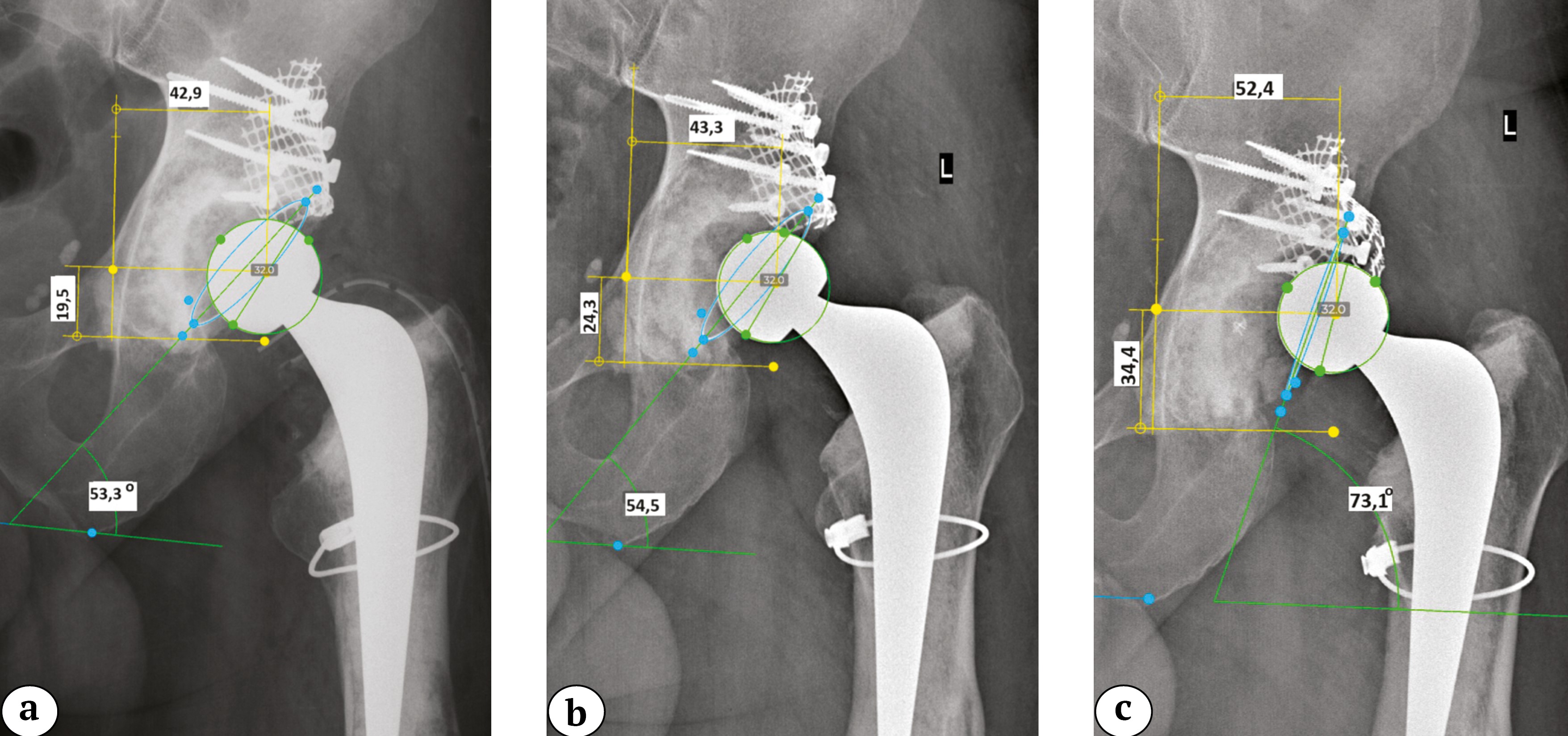 Рис. 9. Клинический пример миграции тазового компонента с развитием расшатывания у пациента 2: a — после операции; b — через 1 год; c — через 5 лет (смещение центра ротации проксимально и кнаружи, увеличение инклинации, уменьшение антеверсии)