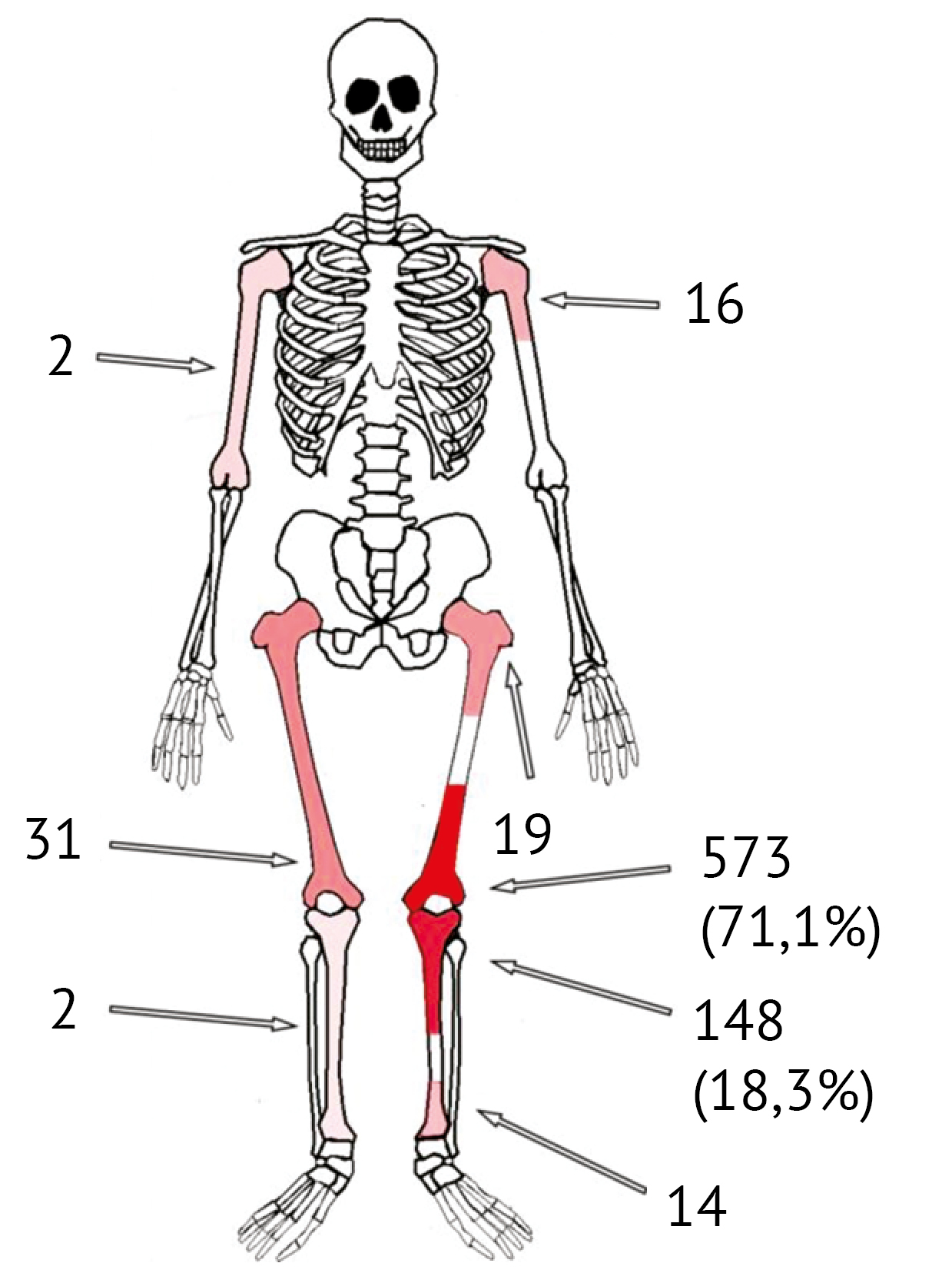 The structure of morphological diagnoses reflects known statistics for malignant tumors of the musculoskeletal system in children and adolescents. Osteosarcoma predominated with 716 (88.8%) cases, followed by Ewing sarcoma — 67 (8.3%) cases. Other musculoskeletal tumors were extremely rare: embryonal rhabdomyosarcoma — 1 case, chondrosarcoma — 3 cases, malignant giant cell tumor — 1 case, pleomorphic sarcoma — 5 cases. Additionally, there were 13 cases where patients had bone metastases with a primary diagnosis of osteosarcoma or Ewing sarcoma.