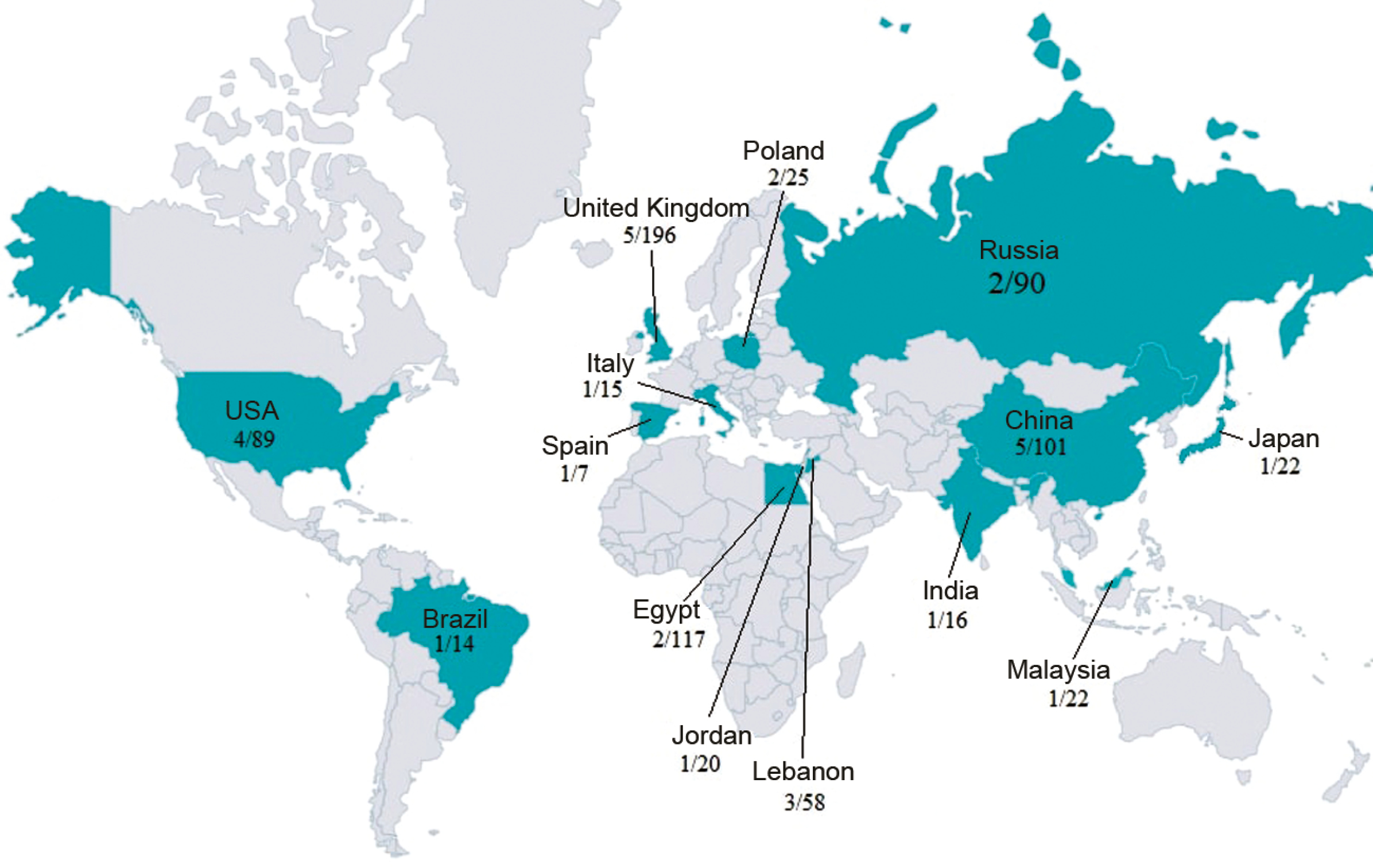 Figure 2. Geographic distribution of studies included in the systematic review (indicating the number of studies/number of patients)