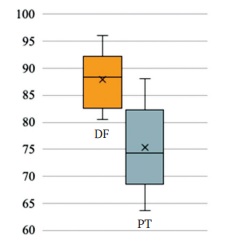 In terms of topography, neoplasms predominantly affected the distal femur (DF) and the proximal tibia (PT). Accordingly, the tumors of the majority of patients experiencing complications following arthroplasty had these localizations. For DF, the total number of complications was 340 (93.15%), while for PT, it was 37 (72.54%). The quality-of-life score according to the MSTS scale was statistically significantly higher (p = 0.0256) in the DF group, with an average score of 86.45% compared to 73.96% in the PT sarcoma group (Figure 6).