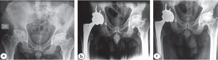 Figure 1. A 36-year-old male patient with bilateral avascular necrosis, right cementless THA (metal-on-polyethylene bearing surface): a — preoperative X-rays; b — X-rays at 6 months post-operatively; c — X-rays at 18 months post-operatively