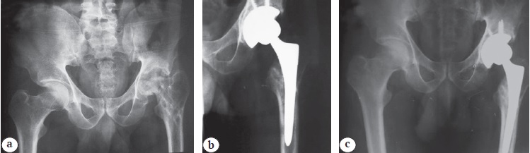 Figure 3. A 30-year-old male patient with advanced left hip avascular necrosis with failed previous core decompression and collapsed femoral head, cementless THA (metal-on-polyethylene bearing surface): a — preoperative X-rays; b — X-rays at 6 months post-operatively; c — X-rays at 20 months post-operatively