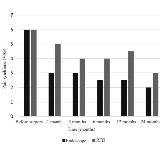 Our study demonstrated that the intensity of back pain decreases more rapidly after endoscopic intervention, and the beneficial effects of the endoscopic treatment were maintained throughout the two-year follow-up period. In contrast, percutaneous RF denervation of the facet joints showed either no effect or only a minor reduction in back pain in 60% (18 patients) of cases. Additionally, patients in this group exhibited negative dynamics, with an increase in average back pain scores within 12 months post-surgery. This could be attributed to the reinnervation of facet joints, leading to the recurrence of pain.