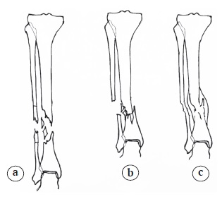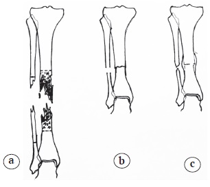 3. Figure 2. Scheme of lower leg shortening and bone callus formation in the wounded patients of group II: a — typical configuration of necrotized fragments ends, definition of a resection boundary (marked with dash lines); b — tight convergence of the fragments ends with the segment shortening; c — fusion with intermediate and periosteal bone callus formation