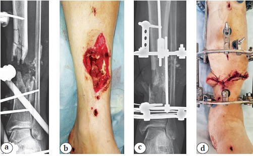 4. Figure 3. Example of applying acute (single-step) shortening technique in patient with a shrapnel wound of the left lower leg and comminuted bone fracture: a — X-ray in the AP view of the left lower leg in external fixator; b — appearance of the wound before surgery, after removal of the external fixator; c — X-ray in the AP view of the left lower leg in the Ilizarov apparatus after shortening by 6 cm; d — appearance of the lower leg with a sutured wound on the 5th day after surgery