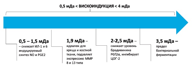 В настоящее время препараты ГК делятся на препараты с очень низкой молекулярной массой (VLMW — very low molecular weight (500–800 кДа), низкой (LMW — low molecular weight (800–1500 кДа), средней (AMW — average molecular weight (1500– 3000 кДа), высокой (HMW — high molecular weight (3000–3500 кДа), сверхвысокой (UHMV — Ultra-high molecular weight (~6000 кДа) и препараты со сшитой структурой (cross-link). Терапевтическая эффективность этих продуктов зависит не только от молекулярной массы, но и в зависимости от происхождения ГК, способа производства, схемы лечения, реологических свойств, периода полураспада в суставе, а также фармакокинетики и фармакодинамики. Продолжительность клинического эффекта препаратов ГК намного длиннее, чем их период полувыведения [48].