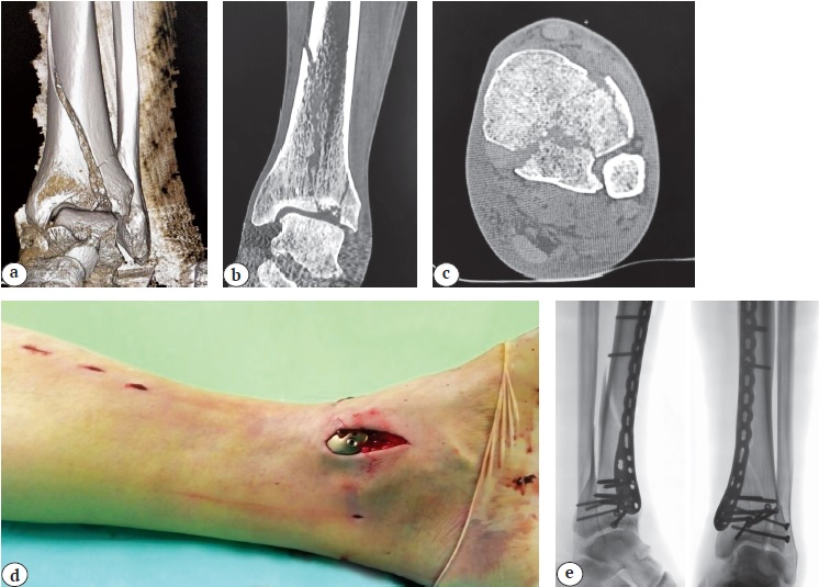 Рис. 1. Перелом пилона типа 43С1 у пациента 68 лет: a, b, c — данные первичной СКТ, позволяющие оценить расположение основных костных фрагментов; d — хирургические мини-доступы; e — рентгенологический результат операции