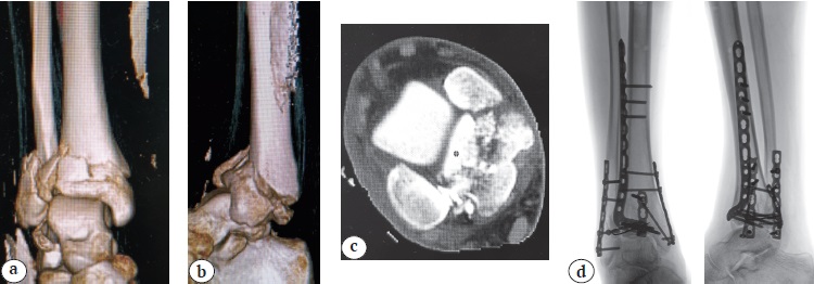 Рис. 2. Перелом дистального отдела голени типа 43С3 у пациента 19 лет: a, b, c — данные первичной СКТ; d — рентгенограммы в прямой и боковой проекциях через 12 мес. после операции