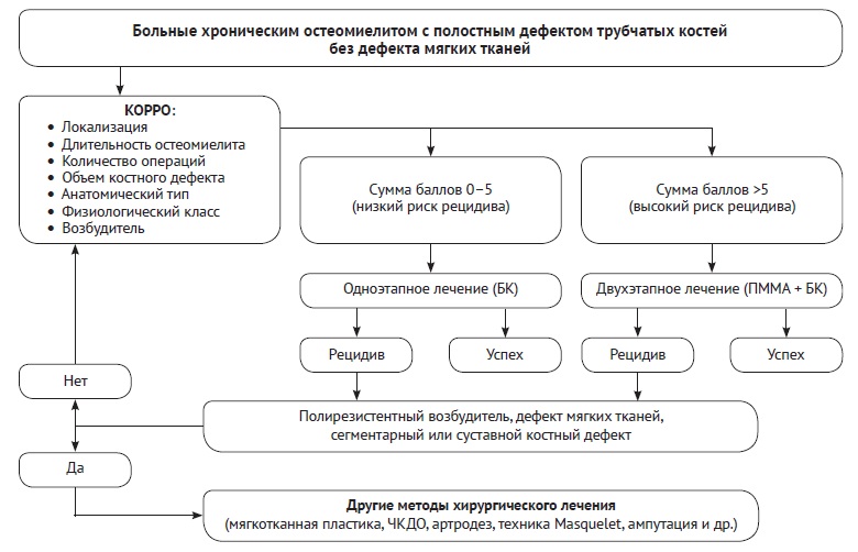 Results. The following factors affecting the treatment outcome were assessed: location (r=0.205, p=0.019); duration of osteomyelitis (r=0.23, p=0.007); history of debridement operations (r=0.264, p=0.002); bone defect volume (r=0.175, p=0.045); physiological class according to Cierny-Mader (r=0.188, p=0.004); anatomical type of osteomyelitis according to Cierny-Mader (r=0.15, p=0.086); nature of the pathogen (r=0.123, p=0.162). The degree of the osteomyelitis recurrence risk, threshold values ​​for quantitative factors and the total score the scale were established. In patients with a score >5, the risk of osteomyelitis recurrence increased by 8.1 times in one-stage treatment compared to patients with a score ≤5 (OR 8.143, CI 1.008-65.882). In two-stage treatment, patients with a score >5 had the risk of osteomyelitis recurrence increased by 4.1 times compared to patients with a score ≤5 (OR 4.059, CI 0.461-35.714). Based on the scale, an algorithm of treatment for these patients was developed.