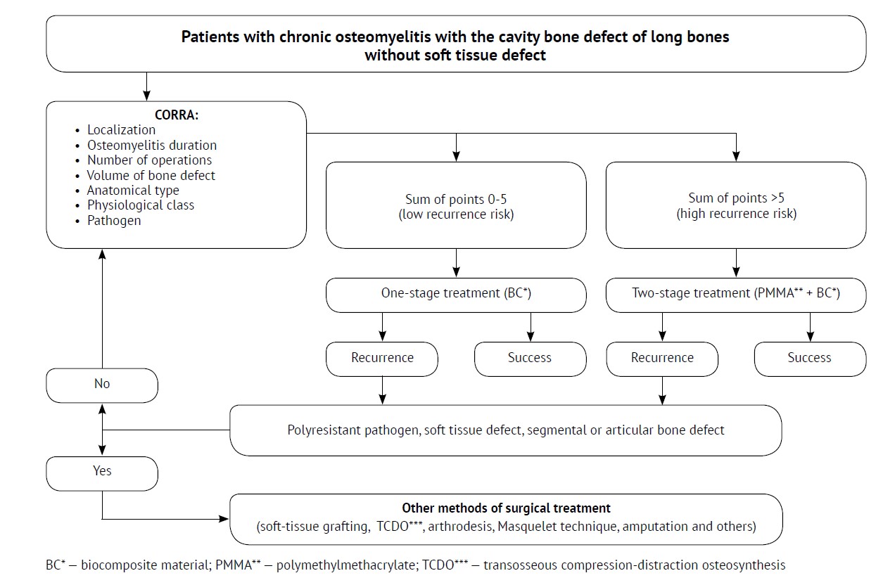 Significant risk factors for the recurrence of infection in patients with chronic osteomyelitis have been identified (localization, duration of osteomyelitis, presence of debridement operation sin the medical history, volume of the bone defect, nature of the pathogen, physiological class, and anatomical type of osteomyelitis according to the Cierny-Mader classification), which facilitated the creation of a scale for Comprehensive Osteomyelitis Recurrence Risk Assessment (CORRA). The application of CORRA may assist in predicting