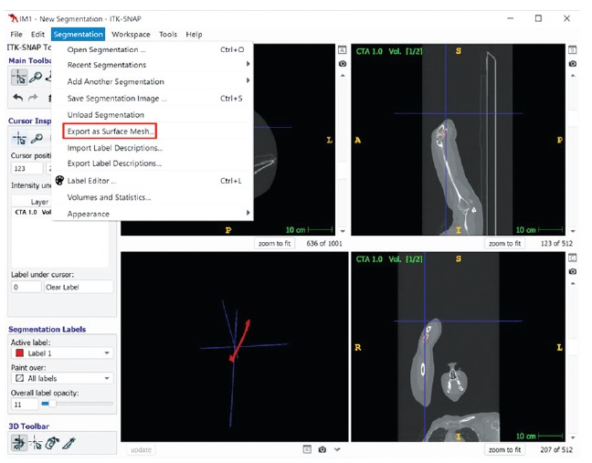 In computer modeling, the first step involves the fragmentation of the bone on the CT scan and converting it into a more convenient three-dimensional format. For this purpose, the open-source ITK-SNAP (GNU General Public License version 3.0 — GPLv3) software was used. After opening the file, the program displays the image in three planes. The fragmentation process consists of the following steps: