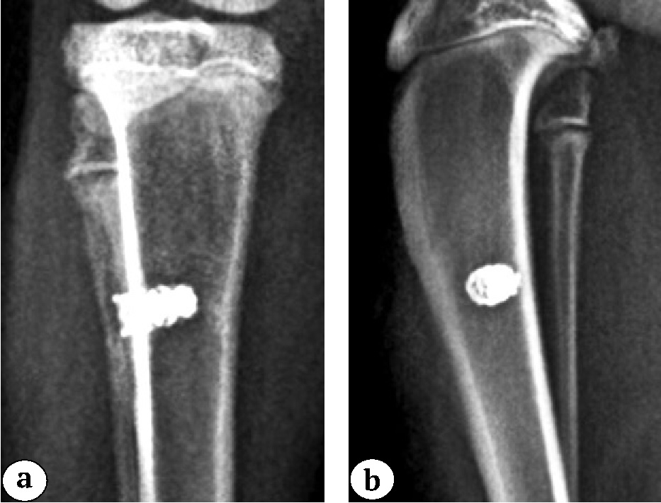 Figure 2 (a, b). X-rays of the proximal tibia of rabbits 4 weeks after integration of 3D-printed implants: a, b — titanium without surface modification