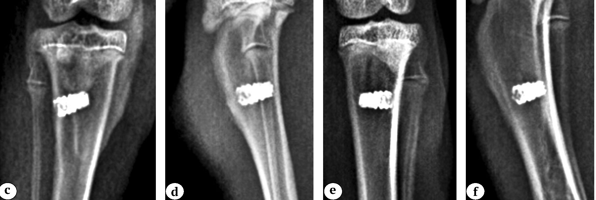 Figure 2 (c, d, e, f). X-rays of the proximal tibia of rabbits 4 weeks after integration of 3D-printed implants: c, d — titanium with surface modification via Ag-containing calcium phosphate coating; e, f — titanium with surface modification via Zn-containing calcium phosphate coating; a, c, e — left limb; b, d, f — right limb
