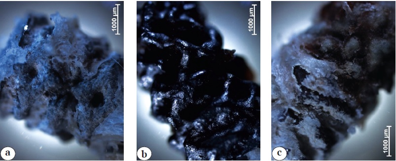 Figure 3. The surface of implants removed from the rabbits’ proximal tibia 4 weeks after installation, examination in reflected light: a — titanium without surface modification; b — titanium with surface modification via Ag-containing calcium phosphate coating; c — titanium with surface modification via Zn-containing calcium phosphate coating