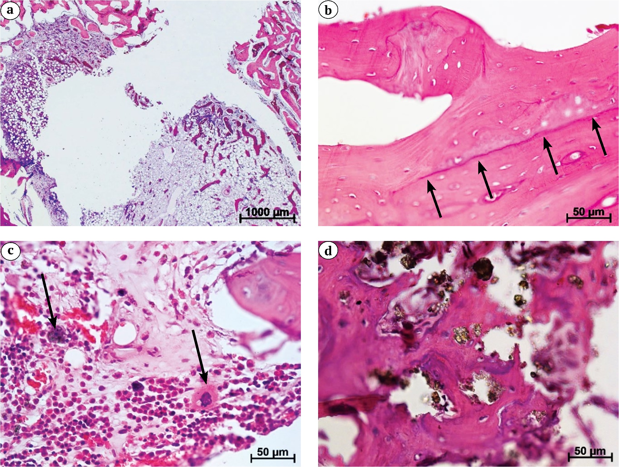 Figure 4 (a, b, c, d). Proximal tibia of the rabbits 4 weeks after implants installation: a — defect of cancellous and compact bone tissue at the site of the removed implant; hyperemia is visible in some areas; b — restoration of compact bone tissue between the head of the implant and the bone edge; the scar is mostly thin (arrows); c — pronounced inflammatory reaction in sclerosed cancellous bone tissue containing numerous metal fragments; hyperemia is present; metal particles surrounded by connective tissue are located among numerous leukocytes and extravascular erythrocytes, with macrophage fusion forming multinucleated cells (arrows); d — significant deformity of sclerosed compact bone tissue between the implant head and the edge of the hole; compact bone contains numerous metal fragments of various shapes and sizes