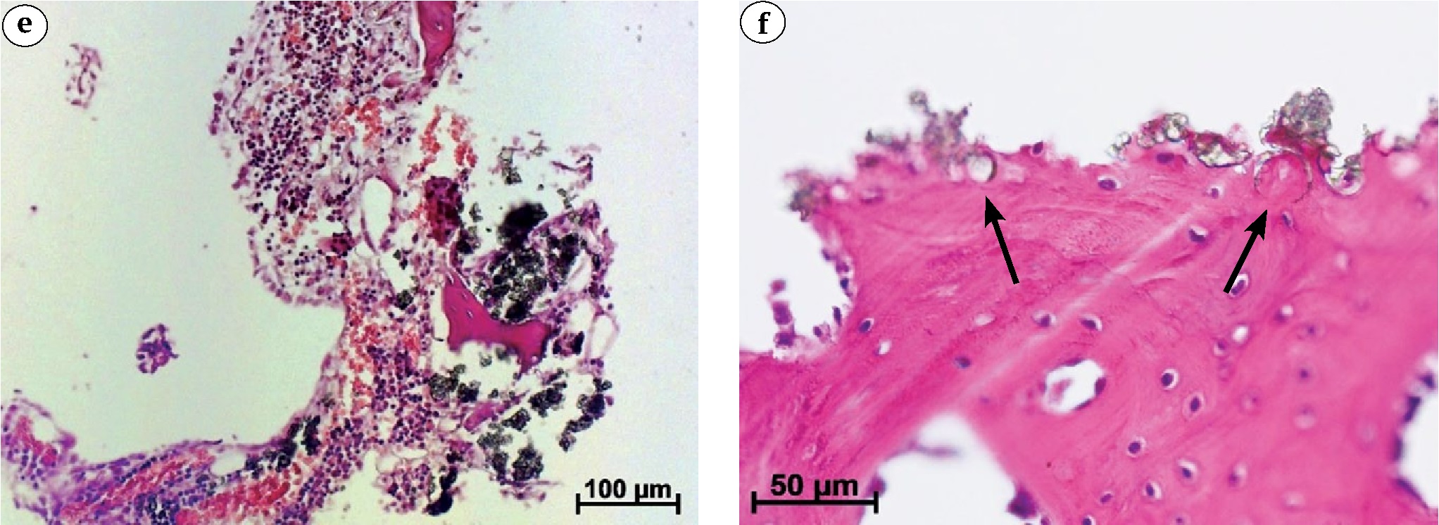 Рис. 4 (e, f). Проксимальный отдел бедренной кости кроликов через 4 нед. после установки имплантатов: e — многочисленные металлические частицы в красном костном мозге с воспалительной реакцией между губчатой костной тканью и имплантатом; f — врастание металлических фрагментов (стрелки) в регенерирующую костную ткань с признаками склероза и рубцовыми изменениями на краю отверстия, где была расположена головка имплантата. Окраска гематоксилином и эозином