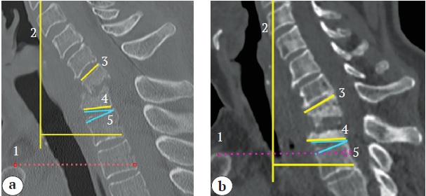 Figure 1. Reconstruction planning scheme: sagittal CT scan showing surgical trajectory (1), cervical sagittal vertical axis C2-C7 (cSVA, 2), local kyphosis (LK, 3), T1 slope (T1S, 4), and neutral thoracic angle (NTA, 5): a — reconstruction without manubriotomy; b — manubriotomy required
