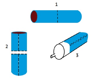 Fig. 3. Stages of an autovenous graft formation from a great saphenous vein: 1 — division of great saphenous vein into two fragments; 2 — dissection of two fragments of great saphenous vein along; 3 — formation of a venous conduit on a syringe cylinder