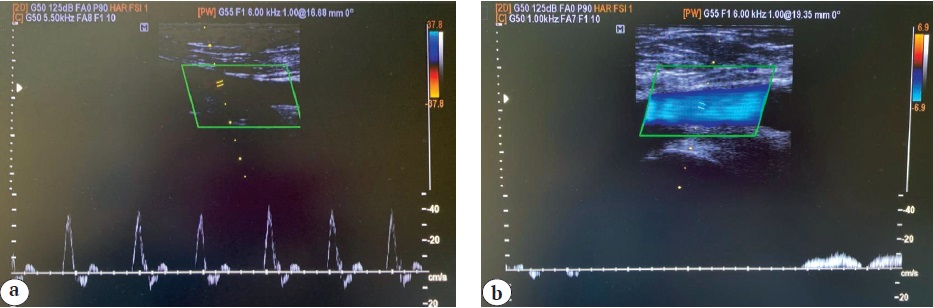 Fig. 5. Ultrasound duplex scanning (control study after 12 months): a — superficial femoral artery; b — common femoral vein