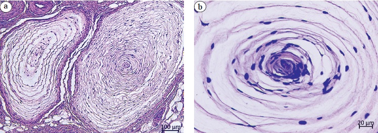 Fig. 1. Vater-Pacinian corpuscles in paraffin sections of the palmar aponeurosis of patients with grade II Dupuytren’s contracture. Сluster of two corpuscles with uneven corrugation of layers of perineural cells and with uneven distances between layers. Stained with hematoxylin and eosin. Mag.: а — ×50; b — ×400