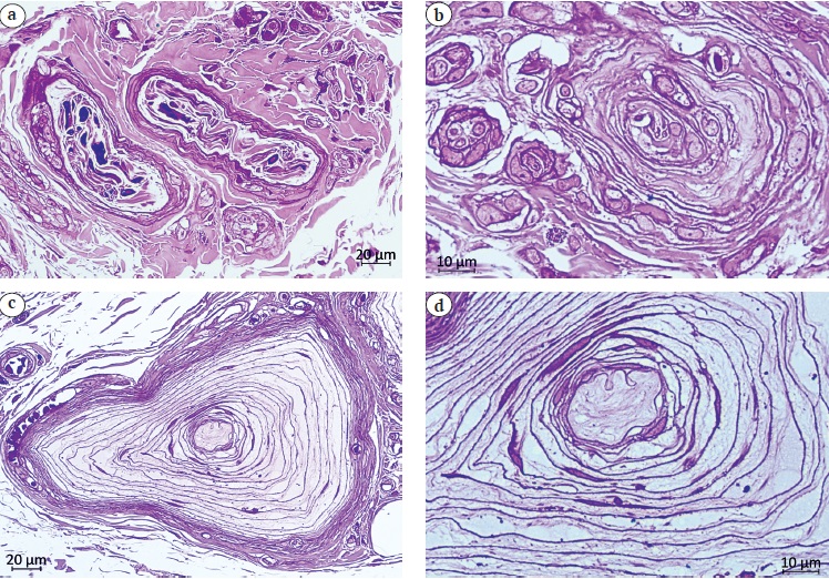 Moreover, a cascade of successive reactive-destructive changes can be detected in Vater-Pacinian corpuscles. Thus, at first the corpuscle, the central part becomes empty because of the destruction of the nerve terminal (Fig. 2 c, d). The circular regularity of the lamellar layers of the inner nucleus and outer capsule begins to deteriorate, pronounced waviness appears, and corpuscle contours start to deform (Fig. 2 c, d).