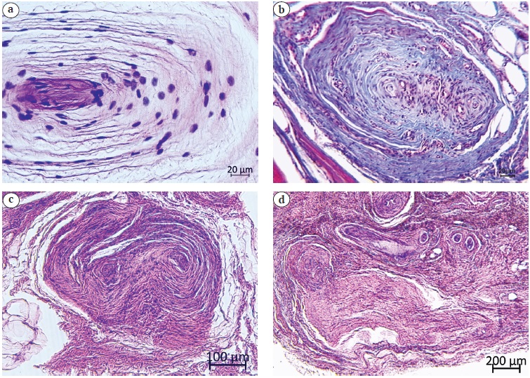 Fig. 3. Vater-Pacinian corpuscles in paraffin sections of the palmar aponeurosis of patients with grade II Dupuytren’s contracture (a, b), grade III (c) and grade III–IV (d): a — macrophages in the interlamellar spaces of the outer capsule; b, c — fibrosis and deformation of the contours; d — destruction of the corpuscles. Stained with hematoxylin and eosin (a, c, d), Masson’s trichromic method (b). Mag.: a — ×400; b, d — ×40; c — ×100