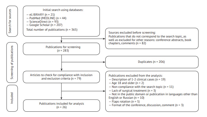 The initial search included 365 sources. After excluding duplicate papers, conference abstracts, book chapters, and comments, 283 studies were selected for screening. After analyzing the headings and abstracts of the articles, checking for compliance with the inclusion criteria, 26 articles directly met the goal of the study. The design of the articles was a description of a series of clinical observations, with the exception of the cohort study of Hwang et al. (2015) [11]. The research selection process is described in more detail in Figure 1.
