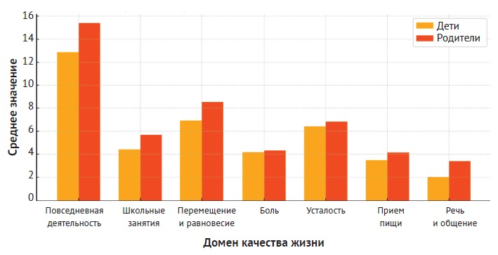Средние значения показателей качества жизни (PedsQL) по доменам у детей составили: «Повседневная деятельность» — 12,87; «Школьные занятия» — 4,42; «Перемещение и равновесие» — 6,92; «Боль» — 4,18; «Усталость» — 6,42; «Прием пищи» — 3,48; «Речь и общение» — 2,02. В родительской версии опросника средние значения по доменам составили: «Повседневная деятельность» — 15,42; «Школьные занятия» — 5,68; «Перемещение и равновесие» — 8,55; «Боль» — 4,31; «Усталость» — 6,84; «Прием пищи» — 4,16; «Речь и общение» — 3,4 (рис. 1).